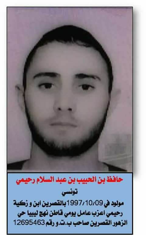 أما الارهابي المقتول الثاني ويدعى حافظ بن الحبيب بن عبد السلام رحيمي فهو من مواليد 1997 أصيل حي الزهور بالقصرين كان ينشط ضمن كتيبة جند الخلافة الموالية لتنظيم داعش الارهابي وتورط سابقا في السطو على فرع بنكي في القصرين.