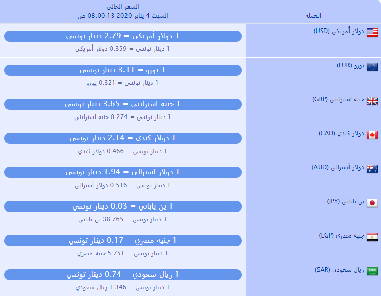 أسعار العملة ليوم السبت 04 جانفي 2020 أمام الدينار التونسي من قبل saber 4 يناير، 2020 4 يناير، 2020 أسعار العملة ليوم السبت 04 جانفي 2020 أمام الدينار التونسي شارك 0 FacebookTwitterEmail المقال السابق تغيرات منتظرة في الطقس اليوم المقال الموالي العاصمة : إشترى قرص مخدر وخبّأه في المنزل فاستهلكته أمه ظنّا أنه “أسبيرين” مقالات ذات صلة تجميع أكثر من 11,7 مليون قنطار من الحبوب... 5 أغسطس، 2025 البنك المركزي ينشر توقعاته بخصوص معدل التضخم 8 أبريل، 2025 مصنع السكر بباجة: غدا يستأنف نشاطه و 8... 31 مارس، 2024 رئيس مدير عام ‘عجيل’: لا زيادة مبرمجة في... 24 مارس، 2024 وزارة التجارة: ”إقرار 3 إجراءات لمراجعة اتفاقية التبادل... 4 ديسمبر، 2023 رفع الدعم والتفويت في المؤسسات العمومية: وزارة الاقتصاد... 14 أكتوبر، 2023