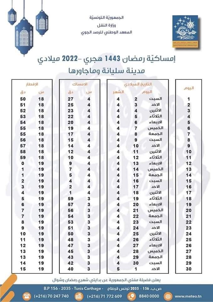 وفي مايلي إمساكيات شهر رمضان المعظم لسنة 1443 هجري لمدينة سليانة و ماجاورها