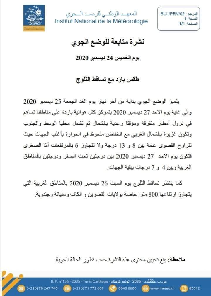 أفاد المعهد الوطني للرصد الجوي، في نشرة متابعة نشرها بعد ظهر اليوم الخميس 24 ديسمبر 2020، بأن الوضع الجوي، يتسم بداية من آخر نهار اليوم الخميس وغدا الجمعة والى غاية الاحد 27 ديسمبر 2020، بتمركز كتل هوائية باردة على البلاد التونسية تساهم في نزول امطار متفرقة ومؤقتا رعدية بالشمال ثم تشمل محليا الوسط والجنوب.