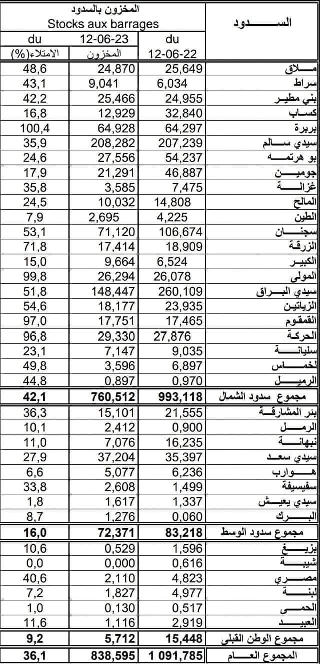 وجاء في الجدول أن نسبة امتلاء سدود الشمال بلغت 42.1% بتعبئة تعادل 760.5 مليون متر مكعب، مقابل 993.1 مليون متر مكعب سنة 2022.