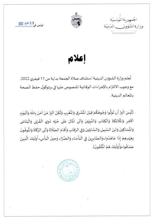 استئناف صلاة الجمعة من قبل saber 9 فبراير، 2022 9 فبراير، 2022 تُعلم وزارة الشؤون الدينية استئناف صلاة الجمعة بداية من 11 فيفري 2022. شارك 0 FacebookTwitterEmail المقال السابق هيئة الدفاع عن الشهيدين: العكرمي متّهم في قضايا تجسس وضالع في الجهاز السري المالي للغنوشي المقال الموالي شقيق شكري بلعيد: “حمة الهمامي خذل الشهيد” مقالات ذات صلة وزارة الصحة: انطلاق الأسبوع العالمي للرضاعة الطبيعية من... 2 نوفمبر، 2025 وزارة الصحة: انطلاق الأسبوع العالمي للرضاعة الطبيعية من... 2 نوفمبر، 2025 إتفاقيات جديدة مع ليبيا وقطر لتأطير تشغيل التونسيين... 2 نوفمبر، 2025 16 ديسمبر.. النظر في مقترح قانون انتداب أصحاب... 30 أكتوبر، 2025 بداية من اليوم : الصّيدليّات تُوقف العمل بصيغة... 27 أكتوبر، 2025 وزارة الصحة : تقنية جديدة لتسريع تشخيص الأمراض... 25 أكتوبر، 2025