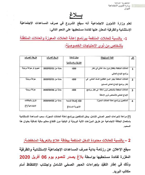 أعلنت وزارة الشؤون الإجتماعية في بلاغ لها أنه سيقع الشروع في صرف المساعدات الإجتماعية الإشتثنائية و الظرفية المعلن عنها لفائدة المستحقين على النحو التالي :