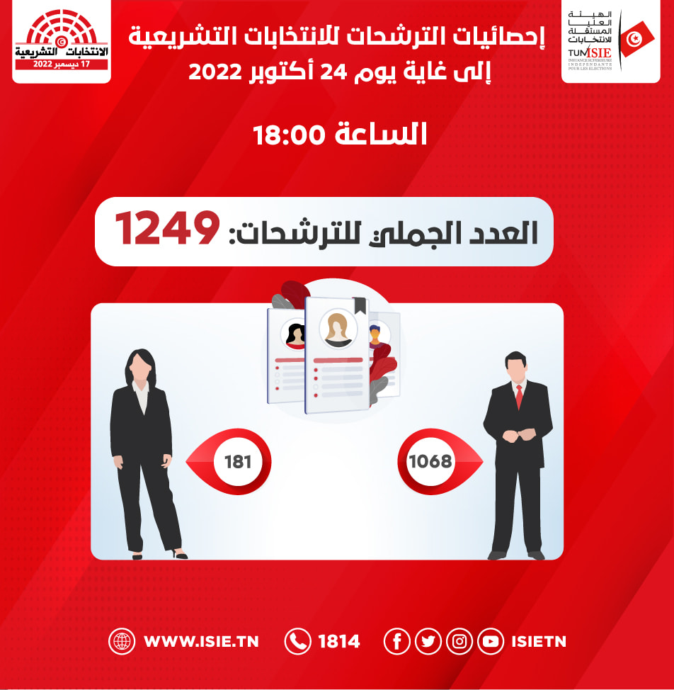 أفادت الهيئة العليا المستقلة للانتخابات أن عدد المترشحين للانتخابات التشريعية بلغ 1249 مترشحا الى غاية اليوم الاثنين 24 أكتوبر 2022.
