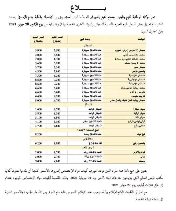 تشهد بعض أسعار البيع للعموم بالنسبة للسجائر وللمواد الأخرى المختصّة بها الدولة تعديلا بداية من الغد، الإثنين 28 جوان 2021، بحسب ما أكّدته وكالة التبغ والوقيد ومصنع التبغ بالقيروان لإي بلاغ اصدرته مساء، الأحد.