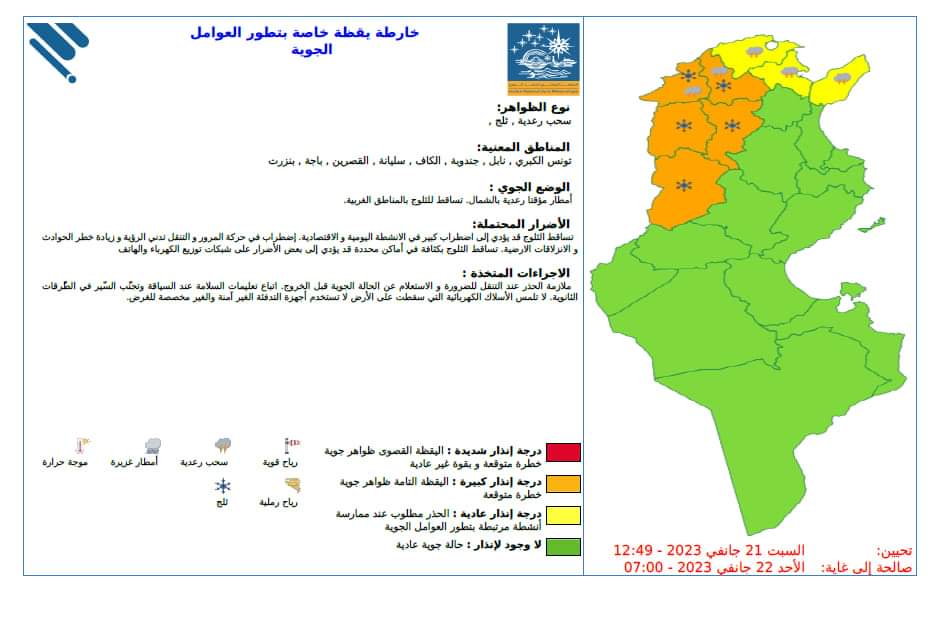 أسند المعهد الوطني للرصد الجوي، في تحيين لأحوال الطقس، اللون البرتقالي لولايات باجة وجندوبة وسليانة والكاف والقصرين في خارطة اليقظة الخاصة بتطور العوامل الجوية، ممّا يعني المرور إلى مستوى حذر عال نتيجة للتراكمات الثلجية المتوقعة والتي قد تكون كثيفة أحيانا بالولايات المذكورة، مما قد ينجر عنه تعطل حركة المرور وعزلة بعض المناطق.