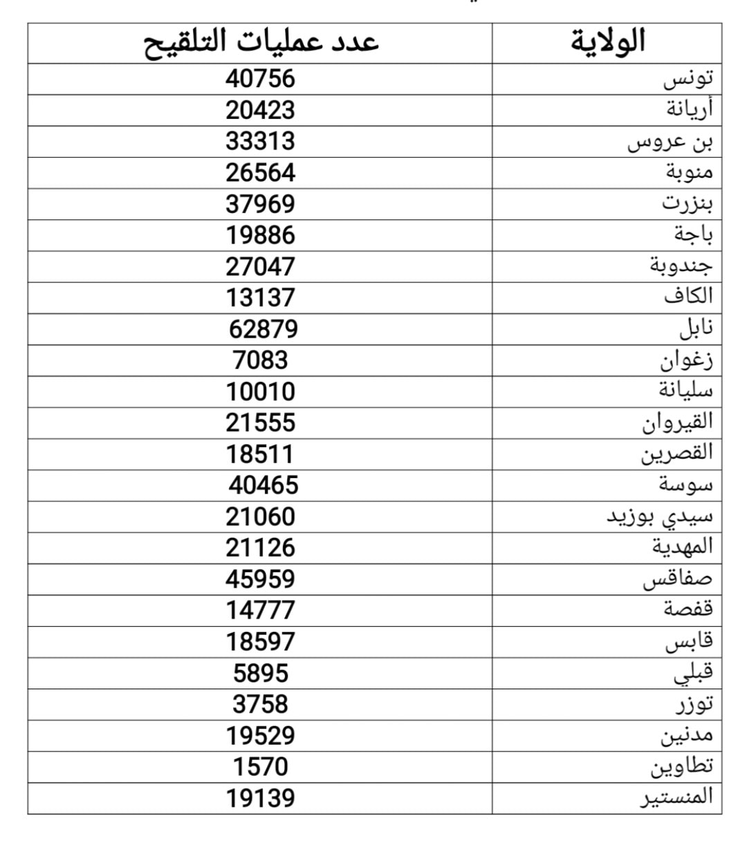 تم اليوم الأحد 08 أوت 2021 تطعيم 551،000 شخصا من الفئة العمرية 40 سنة فما فوق بالجرعة الاولى من اللقاح المضاد لفيروس كورونا في إطار اليوم الوطني المفتوح بكافة ولايات الجمهورية التونسية وهو الرقم النهائي لعدد من تم تطعيمهم.