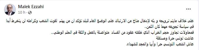 نشر وزير الشؤون الاجتماعية مالك الزاهي تدوينة على صفحته بالفيسبوك للتعليق على تصريحات الأمين العام لاتحاد الشغل نور الدين الطبوبي الذي أكد أن البرنامج الاقتصادي الذي قدمته الحكومة خلال اجتماع مع المنظمة السبت الماضي، يقضي بتجميد الأجور لخمس سنوات قادمة ورفع الدعم عن المواد الأساسية والتفويت في عدد من مؤسسات القطاع العام والتخفيض بنسبة 10 بالمائة في أجور الوظيفة العمومية.