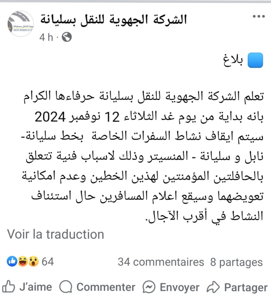 وجاء في ذات المصدر أن هذا أسباب فنية تتعلق بالحافلتين المؤمنتين لهذين الخطين وعدم امكانية تعويضهما، سيقع اعلام المسافرين حال استئناف النشاط في أقرب الآجال.