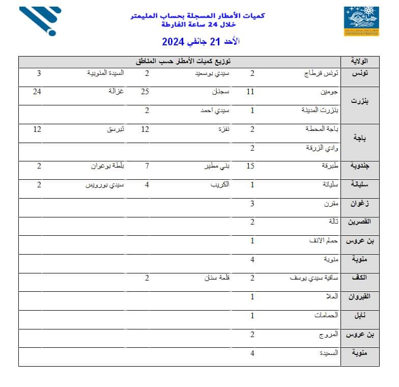 القائمة الاولية لكميات الامطار المسجلة خلال ال24 ساعة الفارطة من قبل saber 21 يناير، 2024 21 يناير، 2024 القائمة الاولية لكميات الامطار المسجلة خلال ال24 ساعة الفارطة. شارك 0 FacebookTwitterEmail المقال السابق سليانة: تقدم موسم جني الزيتون بنسبة 99% المقال الموالي ايقاف مدير مدرسة ومسؤول اثر تسمم جماعي لتلاميذ مقالات ذات صلة 16 ديسمبر.. النظر في مقترح قانون انتداب أصحاب... 30 أكتوبر، 2025 بداية من اليوم : الصّيدليّات تُوقف العمل بصيغة... 27 أكتوبر، 2025 وزارة الصحة : تقنية جديدة لتسريع تشخيص الأمراض... 25 أكتوبر، 2025 شهر أكتوبر الوردي: انتفاع حوالي 150 ألف إمرأة... 24 أكتوبر، 2025 طقس اليوم الخميس 23 اكتوبر 2025 23 أكتوبر، 2025 أصحاب الشهائد العليا ممن طالت بطالتهم: يطالبون بالإنتداب.. 21 أكتوبر، 2025