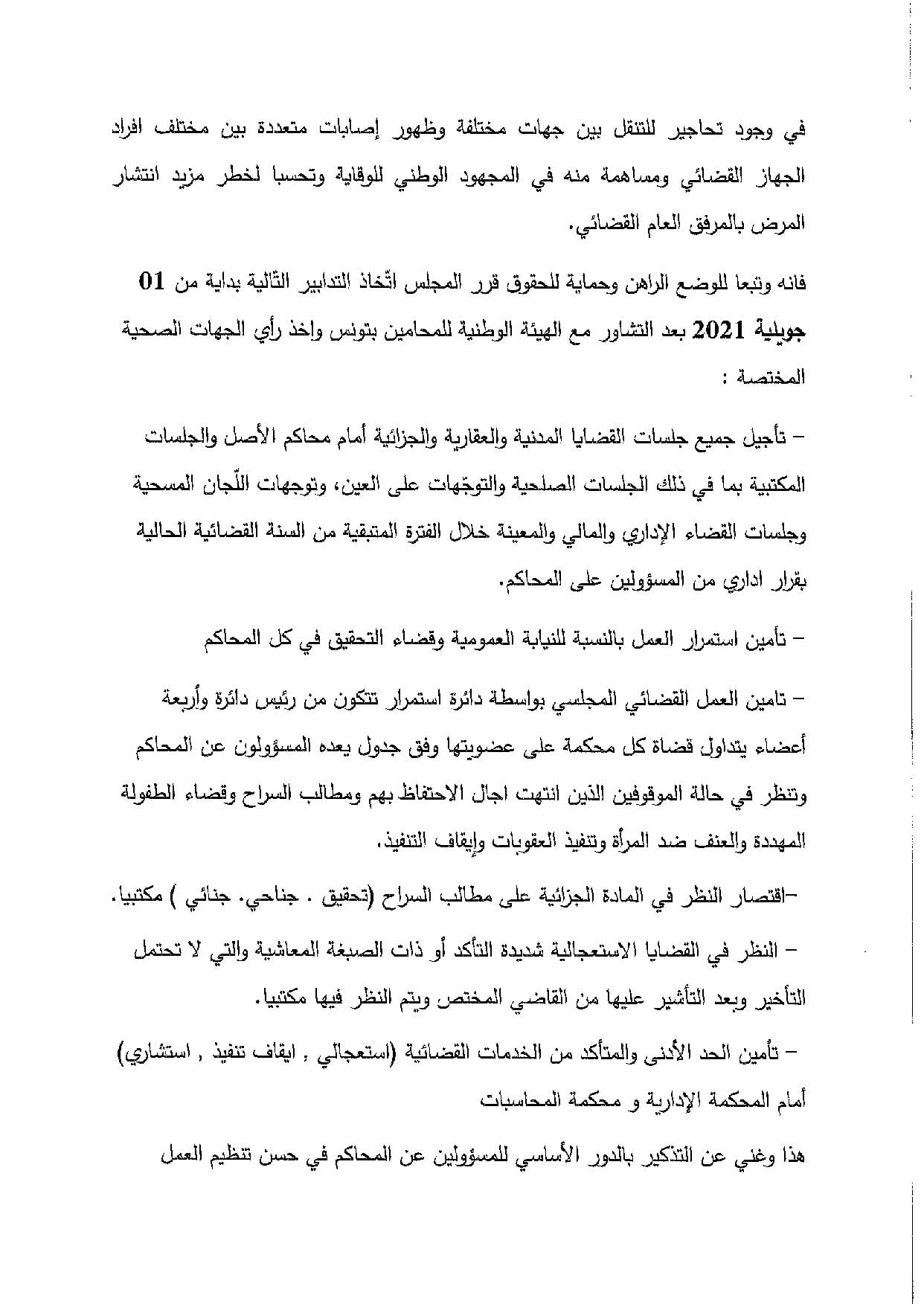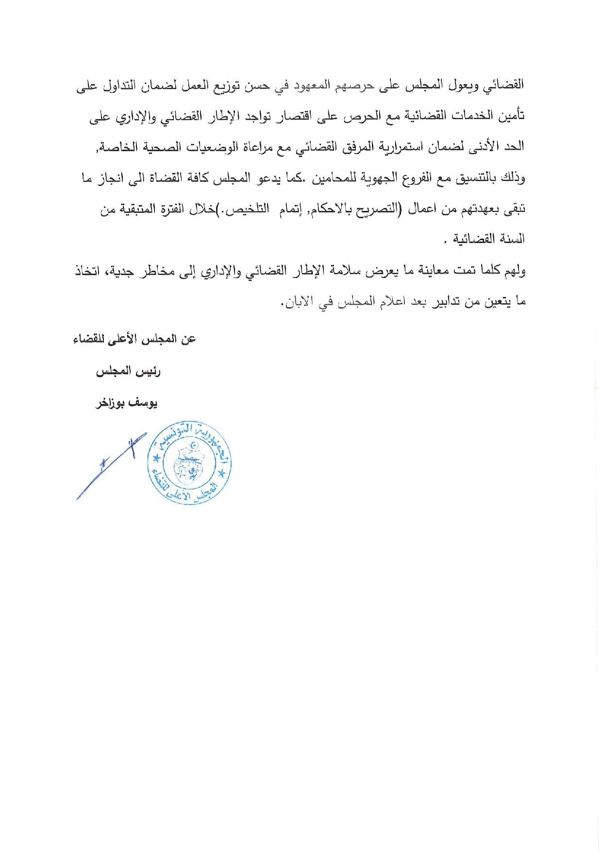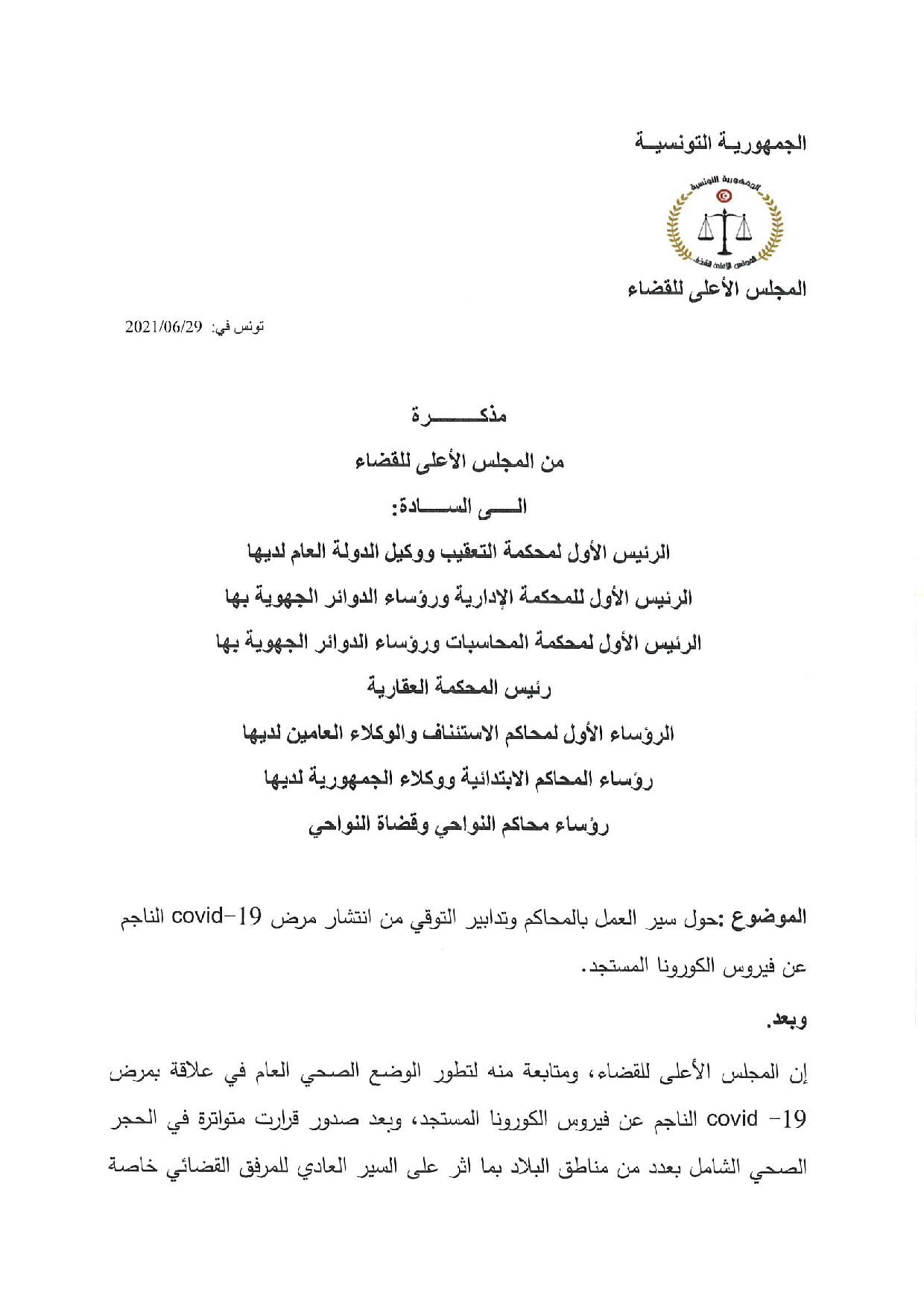 المجلس الأعلى للقضاء: تعليق العمل بكافة محاكم الجمهورية بداية من 1 جويلية المقبل من قبل saber 29 يونيو، 2021 29 يونيو، 2021 المجلس الأعلى للقضاء: تعليق العمل بكافة محاكم الجمهورية بداية من 1 جويلية المقبل شارك 0 FacebookTwitterEmail المقال السابق عدد من الأطبّاء يطالبون قيس سعيّد بفرض الحجر الصحي الشامل وإنزال الجيش لتطبيقه المقال الموالي اليوم ..انطلاق التسجيل في خدمة تلقي نتائج البكالوريا عبر الارساليات القصيرة مقالات ذات صلة أصحاب الشهائد العليا ممن طالت بطالتهم: يطالبون بالإنتداب.. 21 أكتوبر، 2025 أصحاب الشهائد العليا ممن طالت بطالتهم: يطالبون بالإنتداب.. 21 أكتوبر، 2025 تمديد آجال تسجيل الانتفاع بالنسخة الثالثة لبرنامج دعم... 19 أكتوبر، 2025 غــدا : تواصل نزول الأمطار بأغلب الجهات 18 أكتوبر، 2025 22 أكتوبر: انطلاق التسجيل لاجتياز باكالوريا دورة 2026 17 أكتوبر، 2025 كميات الامطار المسجلة خلال الـ 24 ساعة الماضية 16 أكتوبر، 2025