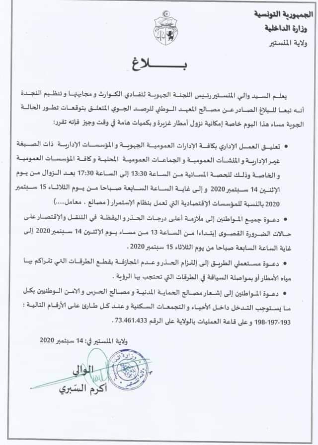 أعلن والي المنستير رئيس اللجنة الجهوية لتفادي الكوارث ومجابهتها وتنظيم النجدة اكرم السبري أثر الاطلاع على نشرة الصادرة عن المعهد الوطني للرصد الجوي المتعلقة بتطور الوضع الجوي وإمكانية نزول أمطار غزيرة في وقت وجيز بعد ظهر يوم الاثنين 14 سبتمبر 2020، عن تعليق العمل بكافة الإدارات العمومية الجهوية وكافة المؤسسات العمومية والخاصة إلى غاية الساعة السابعة من صباح يوم الغد. كما دعا المواطنين إلى ضرورة ملازمة أعلى درجات اليقظة في التنقل والاقتصار على حالات الضرورة القصوى ابتداء من الساعة الواحدة بعد الزوال إلى صباح الغد.