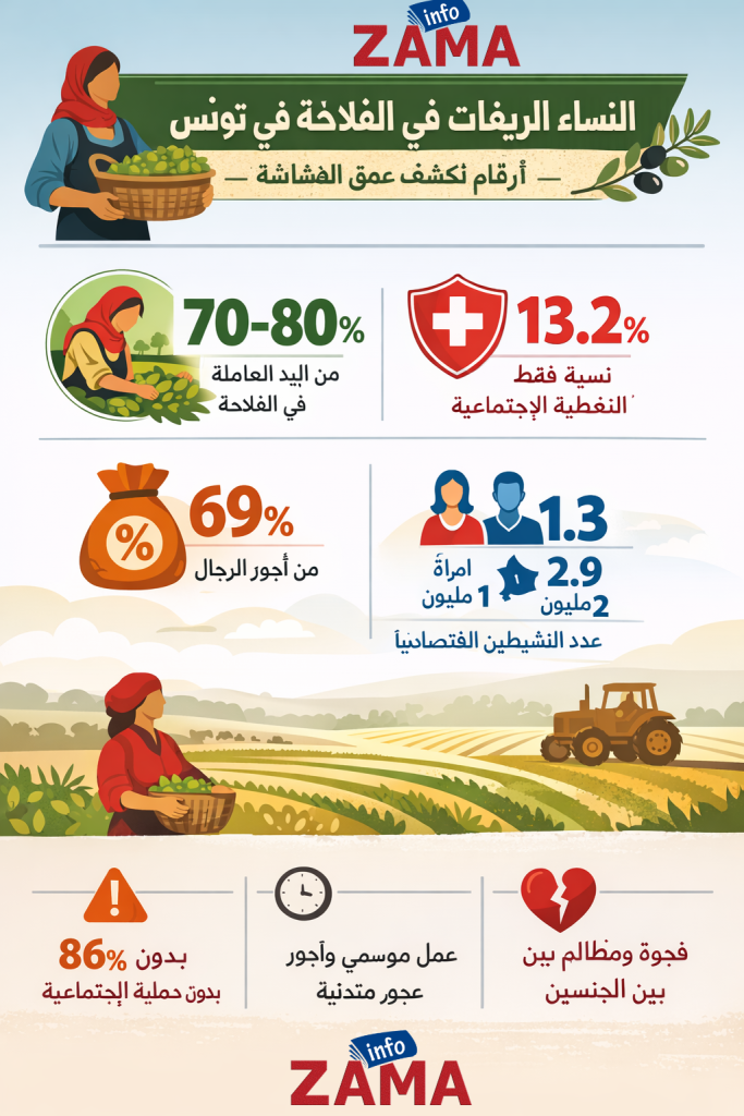 رغم أنهن يشكّلن العمود الفقري للقطاع الفلاحي في تونس، تعيش النساء الريفيات العاملات في هذا المجال على هامش الحماية الاقتصادية والاجتماعية، في مفارقة صارخة بين حجم مساهمتهنّ وواقعهنّ المتردي.