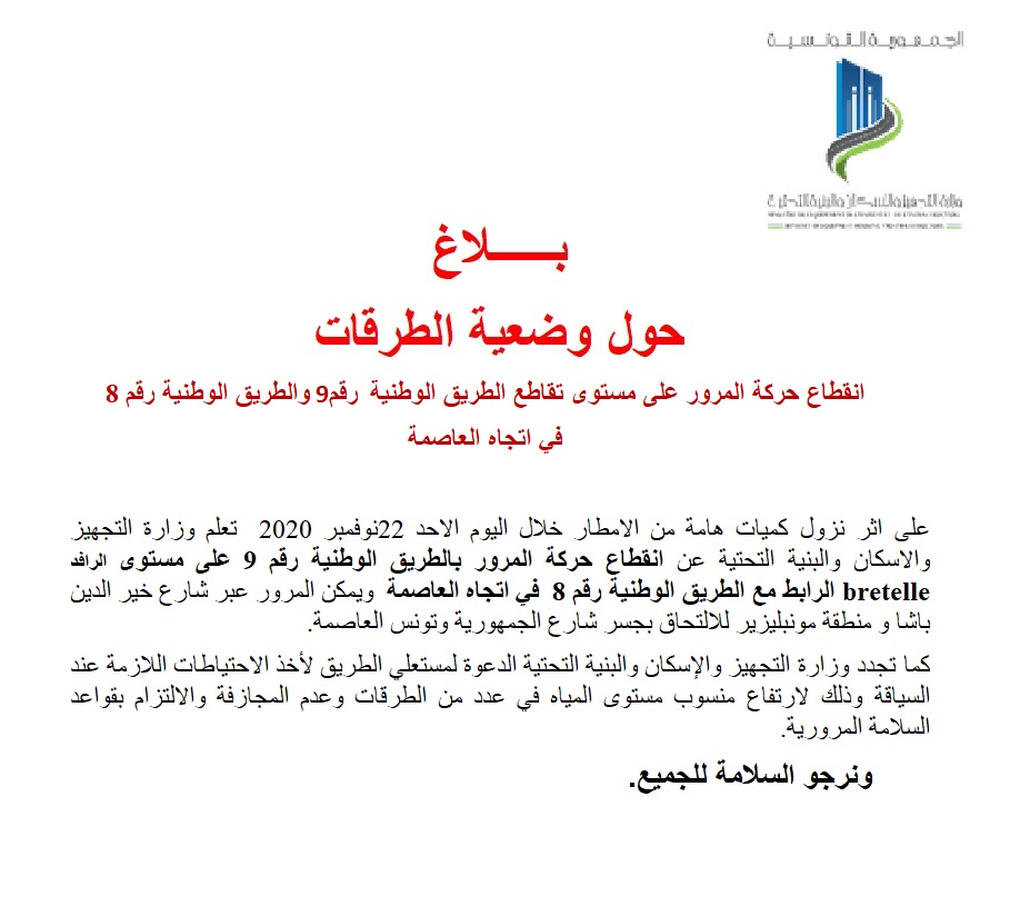 أعلنت وزارة التجهيز مساء اليوم الأحد 22 نوفمبر 2020 عن انقطاع حركة المرور على مستوى تقاطع الطريق الوطنية رقم 9 والطريق الوطنية 8 في اتجاه العاصمة.