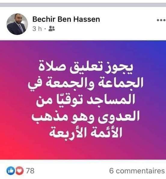 بشير بن حسن: يجوز تعليق صلاة الجماعة و الجمعة توقّيا من العدوى من قبل saber 12 مارس، 2020 12 مارس، 2020 دوّن الشيخ بشير بن حسن منذ قليل على حسابه الشخصي على فايسبوك أنّه يجوز تعليق صلاة الجماعة و الجمعة في المساجد توقيا من العدوى وهو مذهب الأئمّة الأربعة. شارك 0 FacebookTwitterEmail المقال السابق شكري حمودة : الإعلان عن إكتشاف بؤرة للاصابة بكورونا في تونس مسألة وقت المقال الموالي خلال لقاء مع رئيس الجمهورية..مجموعة أبوظبي للاستثمار الإماراتية تعرب عن استعدادها لتمويل المدينة الصحية بالقيروان مقالات ذات صلة 22 جريمة قتل للنساء والعنف الزوجي الأعلى بـ... 1 نوفمبر، 2025 طبيب أسنان يطعن زوجته الطبيبة إثر خلاف عائلي 21 مايو، 2025 ايقاف 7 اشخاص من بينهم الجاني في جريمة... 14 أبريل، 2025 اضطرابات التوحد: غياب احصاءات دقيقة في تونس 2 أبريل، 2025 القيروان: الاحتفاظ بشاب ووالدته بشبهة قتل شقيقه ودفنه... 25 ديسمبر، 2024 63 % نسبة التلاميذ المورّطين في العنف المدرسي... 23 نوفمبر، 2024