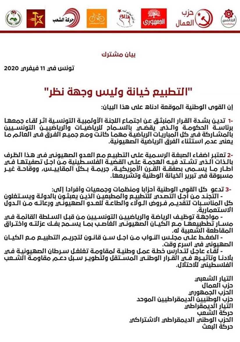 أصدرت سبعة أحزاب تونسية اليوم الثلاثاء 11 فيفري 2020 بيانا مشتركا يدين القرار المنبثق عن اللجنة الأولمبية التونسية إثر لقاء جمعها برئاسة الحكومة الذي يسمح للرياضيات والرياضيين التونسيين في كلّ المباريات الرياضية مهما كانت ومع جميع الفرق في العالم، وهو ما يعني استثناء الفرق الرياضية الصهيونية. وفي ما يلي نصّ البيان: