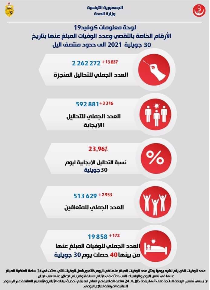تسجيل 172 حالة وفاة و 3316 إصابة جديدة بفيروس كورونا من قبل saber 1 أغسطس، 2021 1 أغسطس، 2021 اعلنت وزارة الصحة تسجيل 172 حالة وفاة و 3316 اصابة جديدة بفيروس كورونا شارك 0 FacebookTwitterEmail المقال السابق مستشار الأمن القومي الأمريكي : ” دعم الرئيس بايدن قوي للشعب التونسي وللديمقراطية التونسية المقال الموالي سليانة: السيطرة على حريق بجبل سريو من معتمدية الكريب مقالات ذات صلة طقس الأربعاء 26 نوفمبر 2025 26 نوفمبر، 2025 انطلاق برنامج توعوي شامل للوقاية ومناهضة العنف ضد... 24 نوفمبر، 2025 وزارة الأسرة:حادثة تعنيف طفل بروضة تعود لديسمبر 2024... 20 نوفمبر، 2025 تونس تستلم 30 قطعة أثرية بعد ترميمها في... 17 نوفمبر، 2025 حالة الطقس 17 نوفمبر، 2025 مفتي الجمهورية يحدد قيمة زكاة الزيتون والتمر 13 نوفمبر، 2025