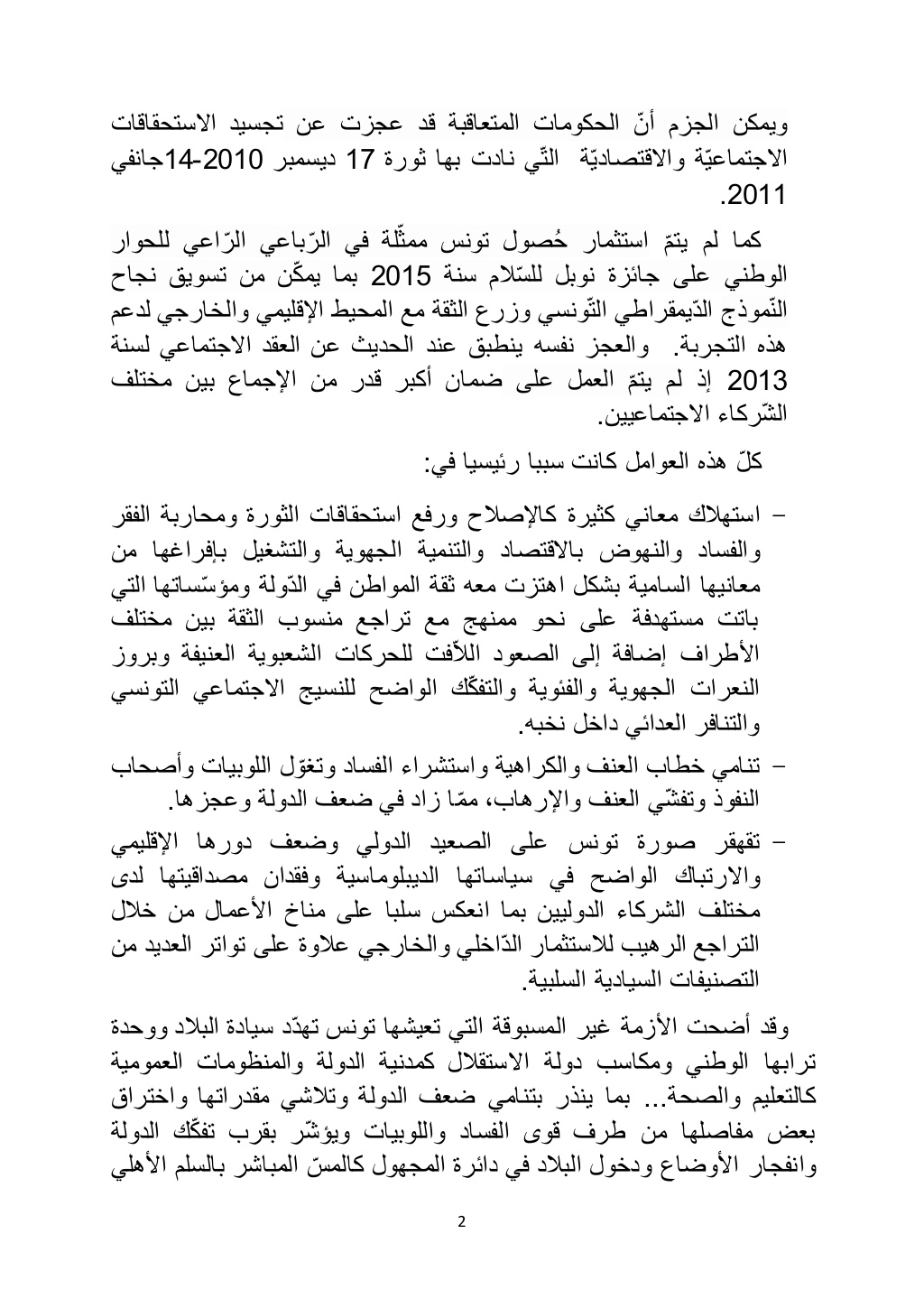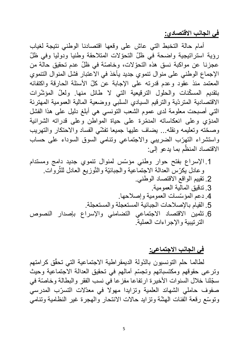 اما على المستوى الاقتصادي فقد دعا الاتحاد الى الاسراع بـ”فتح حوار وطني مؤسس لمنوال تنموي جديد وتقييم واقع الاقتصاد الوطني وتدقيق المالية العمومية ودعم المؤسسات العمومية واصلاحها والقيام بالاصلاحات الجبائية المستعجلة”.