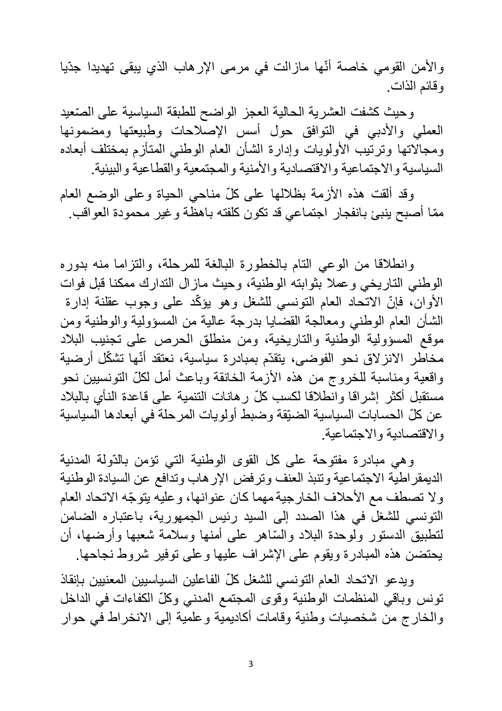 وتضمن نص المبادرة الذي نشرته المنظمة الشغيلة بصفحتها على موقع “فايسبوك”” دعوة من الاتحاد الى كل الفاعلين السياسيين وبقية المنظمات الوطنية وقوى المجتمع المدني وكل الكفاءات في الداخل والخارج من شخصيات وطنية وعلمية واكاديمية الممعنيين بانقاذ تونس الى الانخراط في حوار جدي ومسؤول لتحديد جملة من الخيارات الوطنية وضبط الاستراتيجيات وترتيبها في شكل اولويات عاجلة يتم تبنيها من طرف كل التونسيين” .