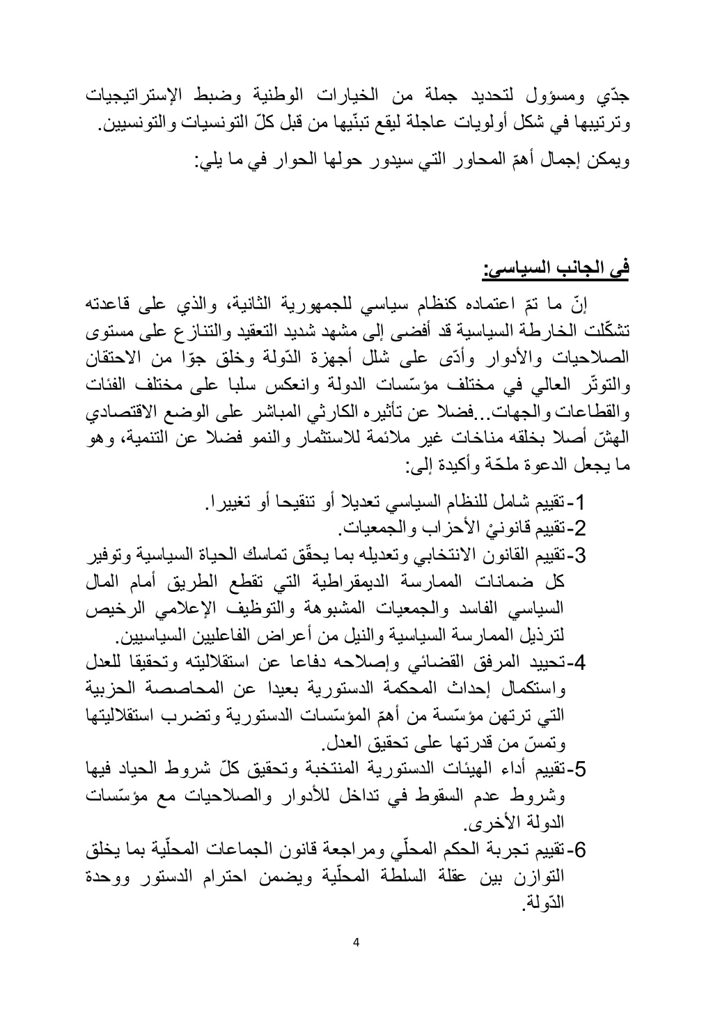 و دعا الاتحاد في مبادرته على المستوى السياسي الى” تقييم شامل للنظام السياسي تعديلا او تنقيحا او تغييرا اضافة الى تقييم القانون الانتخابي وتعديله وتحييد المرفق القضائي واصلاحه وتقييم اداء الهيئات الدستورية” .