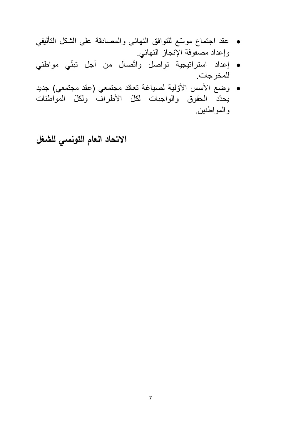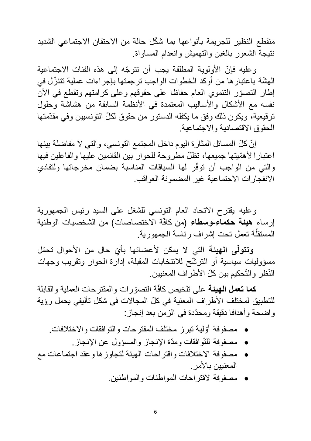 وبالنسبة للجانب الاجتماعي اقترح الاتحاد “ارساء هيئة تحت مسمى “حكماء -وسطاء” تعمل تحت اشراف رئاسة الجمهورية تضم شخصيات وطنية مستقلة وتتولى ادارة حوار اجتماعي وتقريب وجهات النظر والتحكيم بين كل الاطراف المعنيين وتعمل على تلخيص كافة التصورات والاقتراحات العملية والقابلة للتطبيق في كل المجالات “.