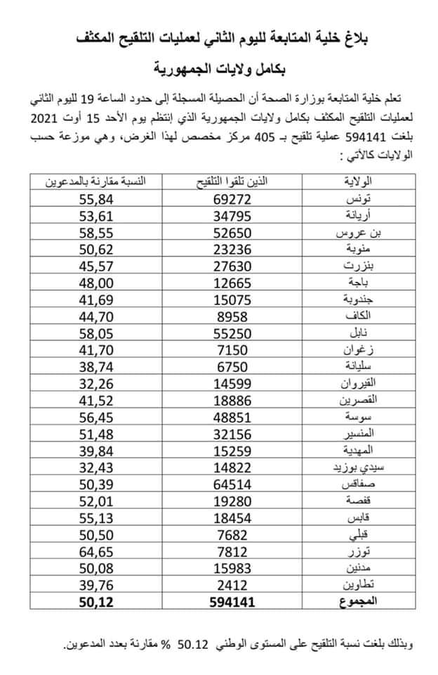أعلنت خلية المتابعة بوزارة الصحة أن الحصيلة المسجلة إلى حدود الساعة 19 لليوم الثاني لعمليات التلقيح المكثف بكامل ولايات الجمهورية الذي إنتظم يوم الأحد 15 أوت 2021 بلغت 594141 عملية تلقيح بـ 405 مركز مخصص لهذا الغرض، وهي موزعة حسب الولايات كالآتي :