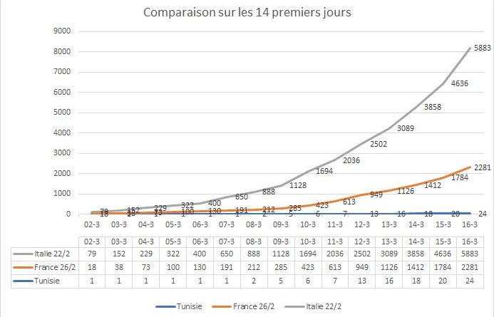 حسب رسم بياني يقارن سرعة انتشار فيروس الكورونا بين تونس وفرنسا وايطاليا، يلاحظ ان سرعة انتشار المرض في تونس منذ الاعلان عن اول حالة يوم 2 مارس 2020( على امتداد 15 يوم) هي اقل بكثير من سرعة الانتشار التي شهدها الوباء في كل من ايطاليا وفرنسا حيث ان تونس سدجلت 24 حالة خلال ال14 يوزم الاول منذ الاعلان عن اول حالة في حين ان عدد الاصابات الرسمية في ايطاليا بلغ 5583 خلال ال14 يوم الاول اما عدد الاصابات في فرنسا فقد بلغ 2281 حالة.