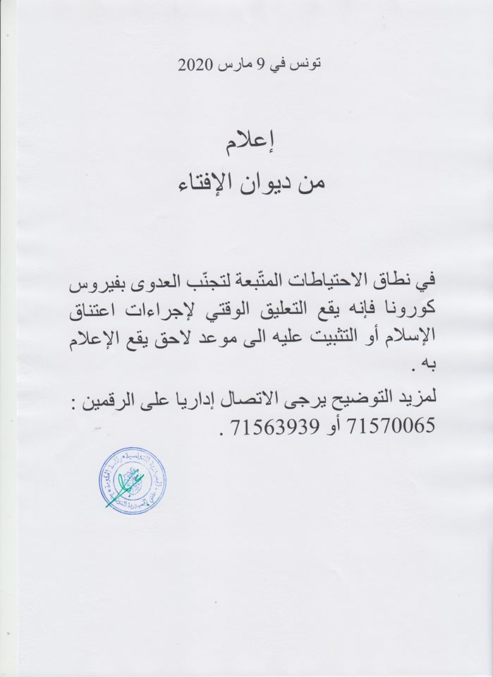 أعلن ديوان الإفتاء في بلاغ اليوم الإثنين 9 مارس 2020، تعليق إجراءات اعتناق الإسلام أو التثبيت عليه وقتيا وذلك في نطاق الإحتياطات المتّبعة لتجنّب العدوى بفيروس كورونا .