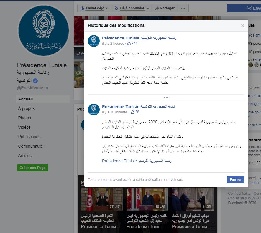 و قالت رئاسة الجمهورية في بلاغ انه كان من المنتظر أن تخصّص الندوة الصحفية التي عقبت لقاء رئيس الجمهورية برئيس الحكومة المكلف لتقديم تركيبة الحكومة الجديدة لكن تمّ اختيار مواصلة المشاورات، على أن يتمّ الإعلان عن تشكيل الحكومة في أقرب الآجال.