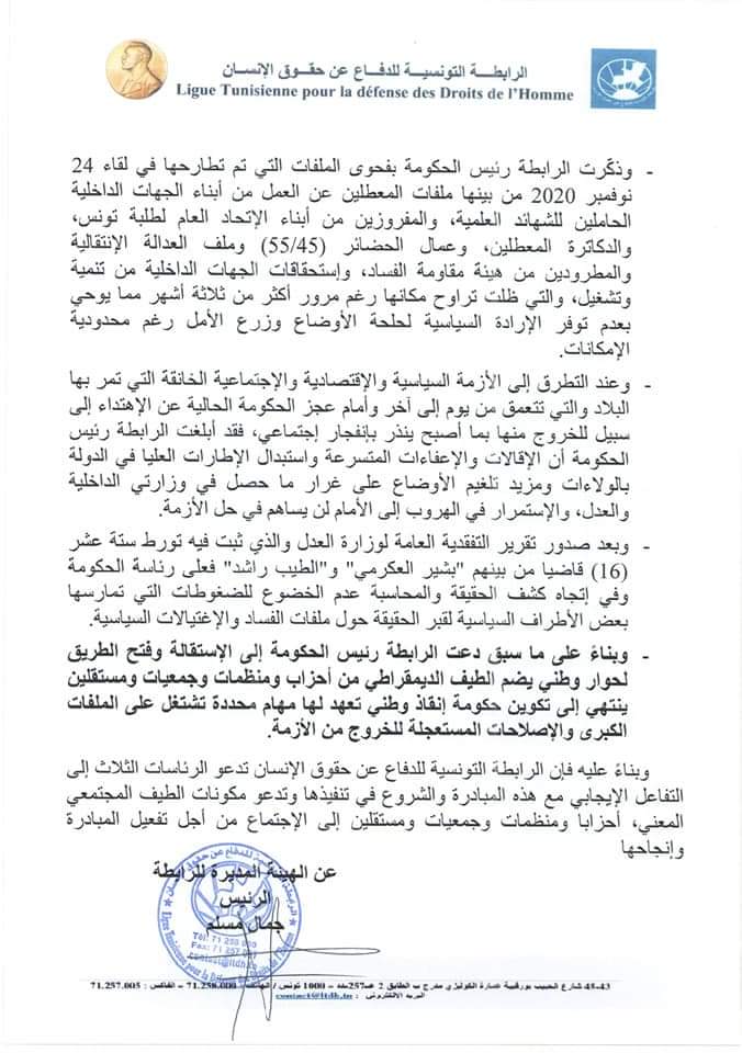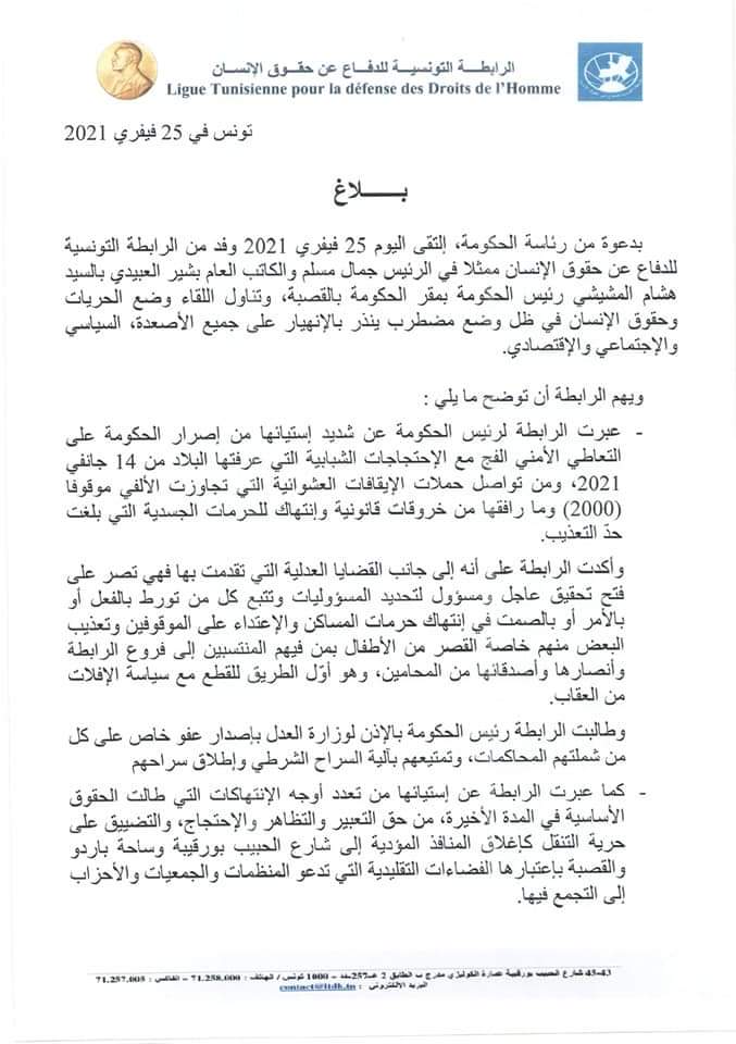 دعت الرابطة التونسية للدفاع عن حقوق الانسان، في بلاغ اليوم الخميس 25 فيفري 2021، رئيس الحكومة هشام المشيشي إلى الاستقالة.جاء ذلك عقب لقاء جمعه وفد من الرابطة برئيس الحكومة، اليوم بالقصبة، تم فيه النظر في وضع الحريات وحقوق الانسان في ظل وضع مضطرب ينذر بالانهيار على جميع الأصعدة.وفيما يلي نص البلاغ كاملا: