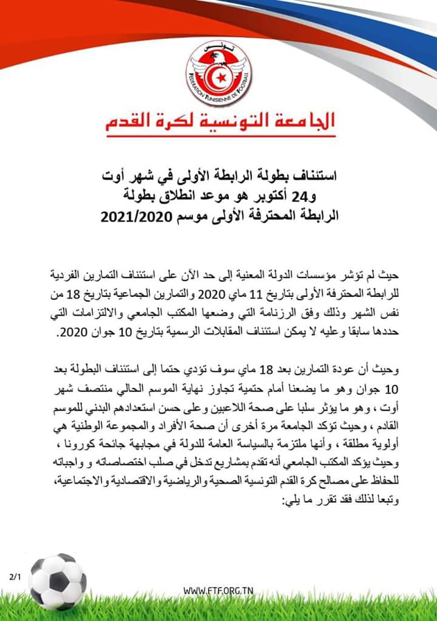اصدرت الجامعة التونسية لكرة القدم بلاغا اليوم الجمعة بخصوص موعد عودة نشاط الرابطة المحترفة 1 و 2