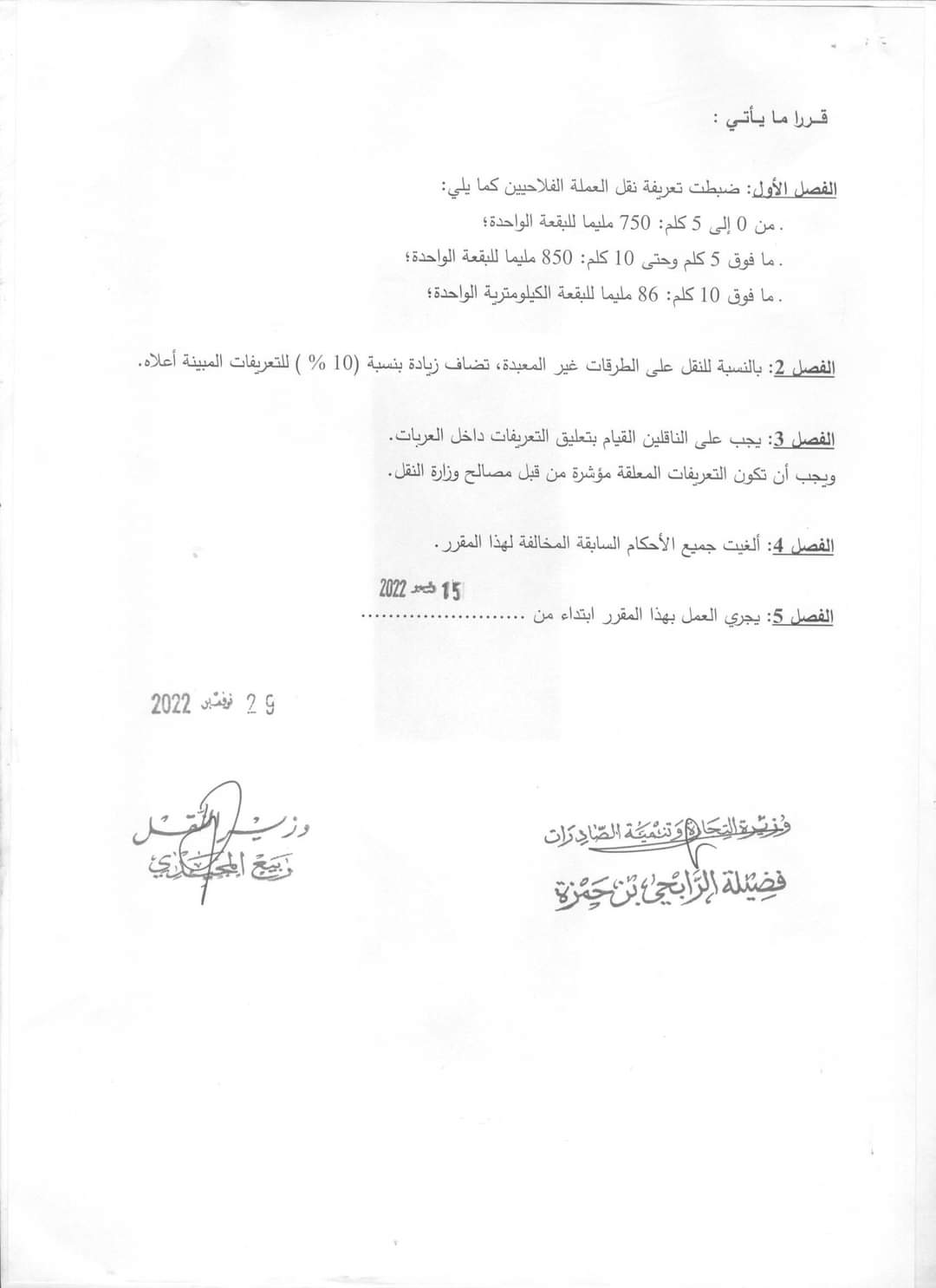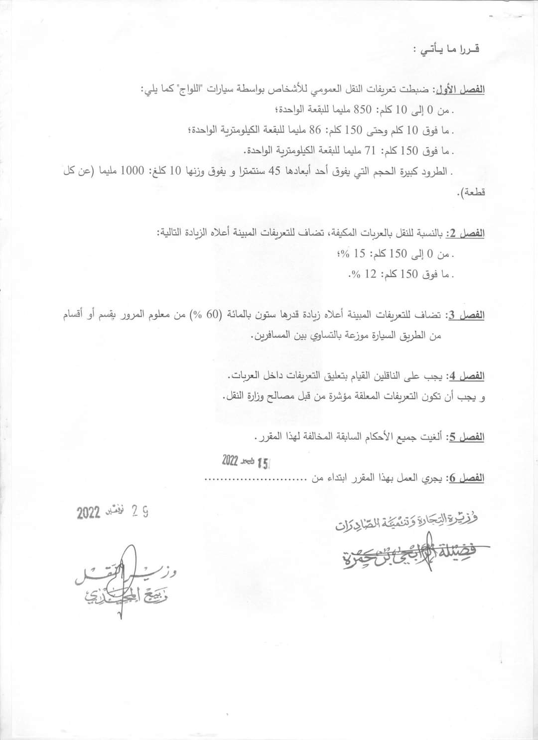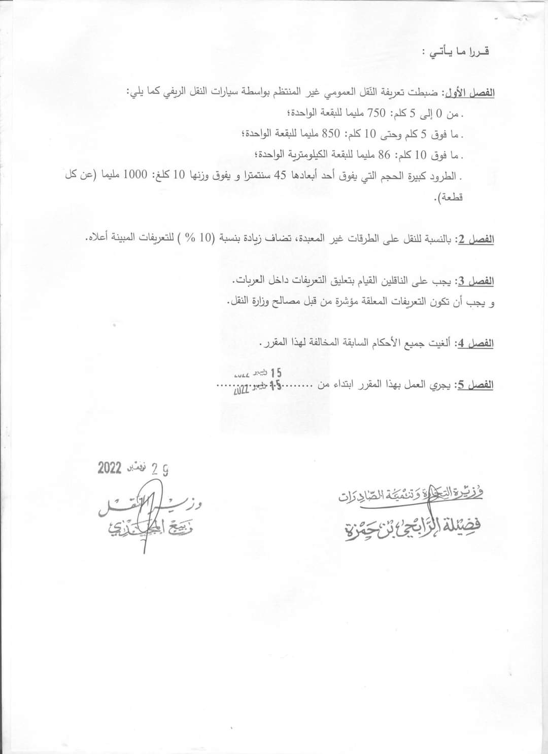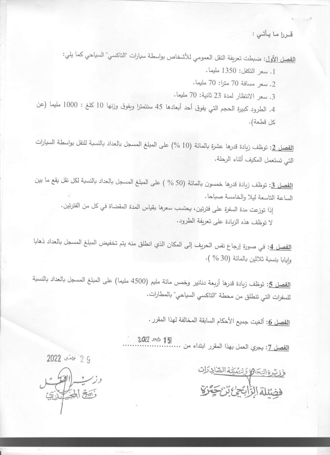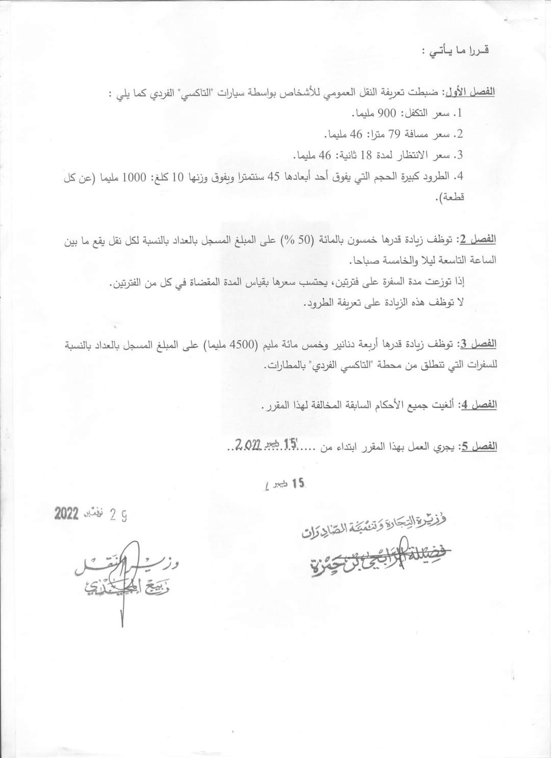 أعلنت وزارة النّقل، في بلاغ لها، اليوم الخميس 1 ديسمبر 2022، أنّه بالتنسيق مع وزارة التجارة وتنميّة الصادرات، تقرّر تعديل تعريفات النقل العمومي غير المنتظم للأشخاص (التاكسي الفردي، سيارات “اللواج”، التاكسي السياحي، النقل الريفي).