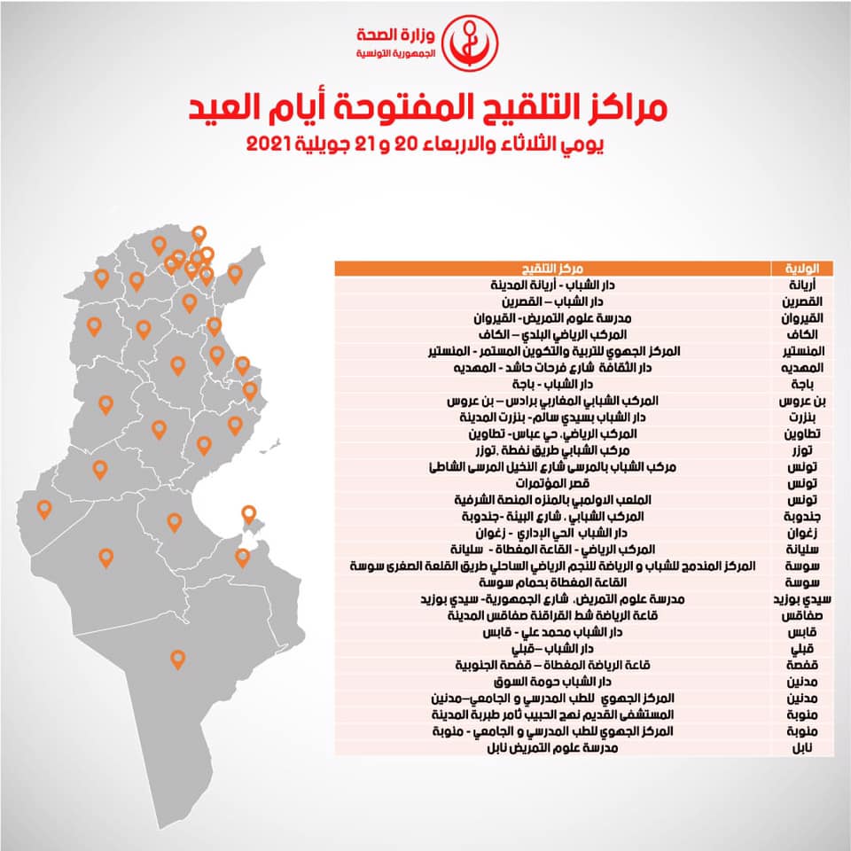 وم الثلاثاء من الساعة الواحدة بعد الظهر (13.00) الى غاية الساعة السابعة مساء (19.00) ويوم الاربعاء من الساعة الثامنة صباحا (08.00) الى حدود الساعة السابعة مساء (19.00) لتطعيم المواطنين والمواطنات بالجرعة الأولى للقاح المضاد لفيروس كورونا.واللقاحات المستعملة خلال ايام العيد هي استرازنكا للفئة العمرية 45 سنة فما فوق وسينوفارم الصيني للفئة العمرية 18 سنة فما فوق.