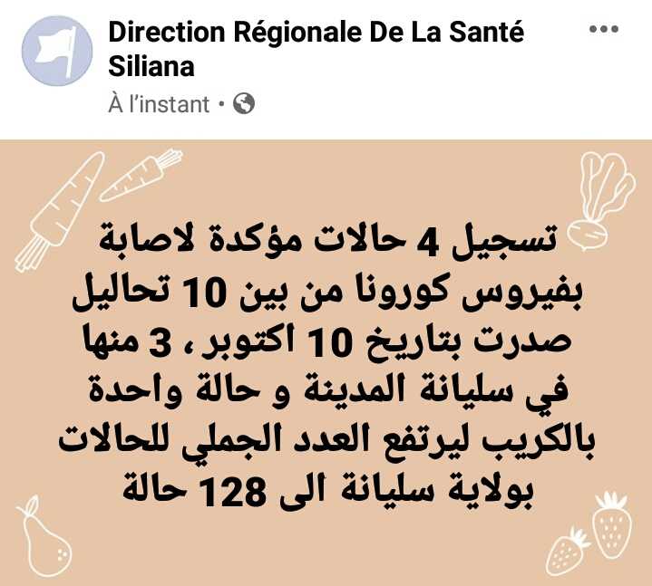 أعلنت الإدارة الجهوية للصحة بسليانة مساء اليوم عبر صفحتها الرسمية عن تسجيل 4 إصابات جديدة بفيروس كورونا بولاية سليانة منها 3 حالات بسليانة المدينة و حالة بمعتمدية الكريب.