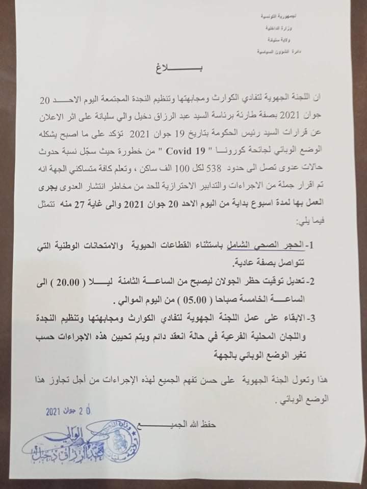 فرض الحجر الصحي الشامل بكامل ولاية سليانة لمدة اسبوع بداية من يوم الاحد 20 جوان 2021 باستثناء المؤسسات التربوية لاستكمال الامتحانات الوطنية و انهاء السنة الدراسية.