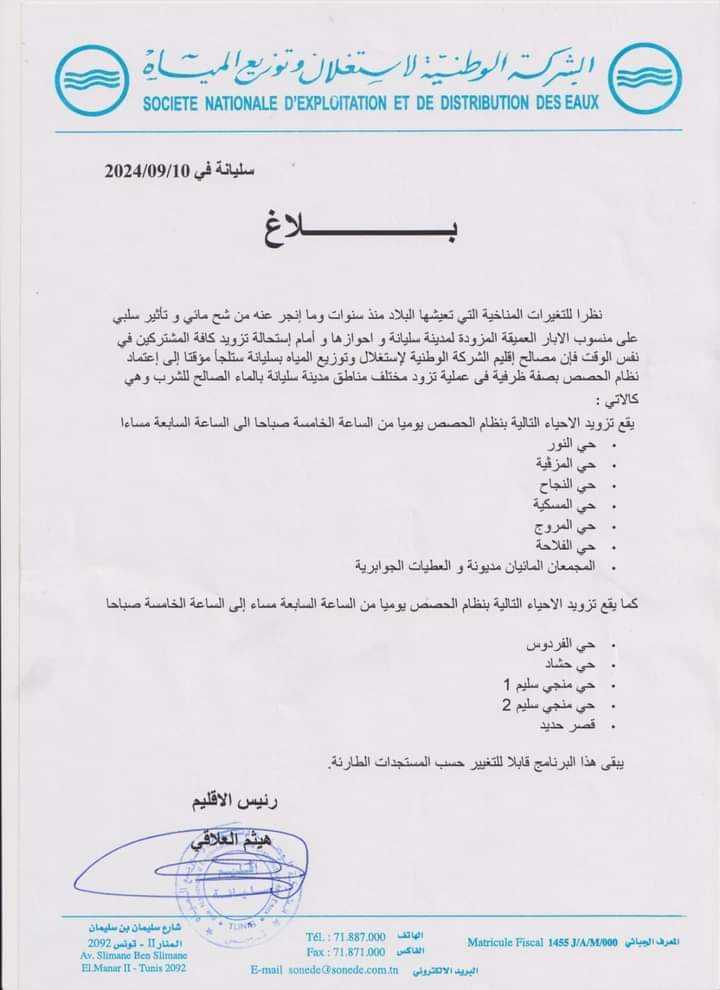 سليانة: اعتماد نظام الحصص لتزويد عدد من الأحياء بالماء بسبب الشح المائي من قبل saber 11 سبتمبر، 2024 11 سبتمبر، 2024 أعلنت الشركة الوطنية لإستغلال وتوزيع المياه إقليم سليانة اعتماد نظام الحصص في تزويد عدد من الأحياء بالماء الصالح للشراب. وقد شمل هذا القرار الأحياء التالية: شارك 0 FacebookTwitterEmail المقال السابق فتح المنصة الرقمية للترسيم بالمبيتات والمطاعم المدرسية والتمتع بالمنحة المدرسية المقال الموالي سليانة: افتتاح مركز “الأمان” لإيواء النّساء ضحايا العنف ببوعرادة مقالات ذات صلة سليانة: افتتاح موسم جني الزيتون 25 أكتوبر، 2025 سليانة: برمجة زراعة 200 ألف هكتار زراعات كبرى 23 أكتوبر، 2025 سليانة: قريبا الإعلان عن طلب العروض المتعلق بمشروع... 21 أكتوبر، 2025 سليانة: تأثير ايجابي للأمطار الأخيرة التي شهدتها الجهة... 20 أكتوبر، 2025 الشركة الجهوية للنقل بسليانة تتسلم تتسلم حافلات جديدة(صور) 9 أكتوبر، 2025 سليانة: تنظيم يوما تحسيسيا لتقصي سرطان الثدي والاستعمال... 7 أكتوبر، 2025