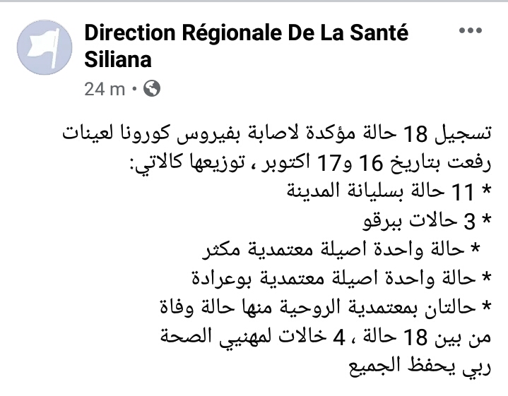 سليانة: تسجيل 18 إصابة جديدة بفيروس كورونا من قبل saber 18 أكتوبر، 2020 18 أكتوبر، 2020 اعلنت الإدارة الجهوية للصحة بسليانة اليوم الأحد 18 اكتوبر 2020 عن تسجيل 18 إصابة جديدة بفيروس كورونا بولاية سليانة. شارك 0 FacebookTwitterEmail المقال السابق وفاة قيادي عسكري بالجيش الوطني بفيروس كورونا المقال الموالي وفاة السيدة نعمة مقالات ذات صلة الشركة الجهوية للنقل بسليانة تتسلم تتسلم حافلات جديدة(صور) 9 أكتوبر، 2025 سليانة: تنظيم يوما تحسيسيا لتقصي سرطان الثدي والاستعمال... 7 أكتوبر، 2025 سليانة: الإعداد لقبول 1000 طفل في إطار برنامج... 6 أكتوبر، 2025 سليانة الأولى وطنيا في إنتاج الصنوبر الحلبي 3 سبتمبر، 2025 سليانة: فسخ عقد المقاول المتعهد بأشغال المسبح البلدي 30 أغسطس، 2025 الاثنين القادم: استئناف العمل بالتوقيت الشتوي 29 أغسطس، 2025