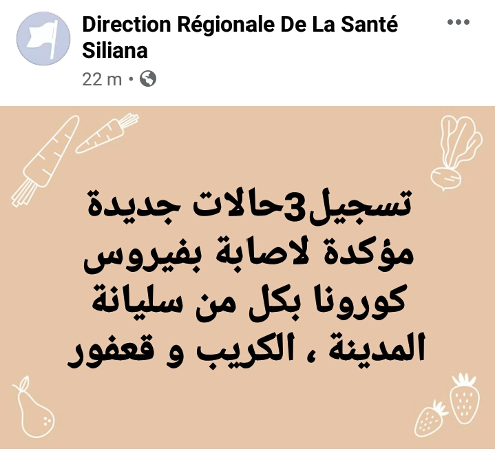 سليانة: تسجيل 3 إصابات جديدة بفيروس كورونا من قبل saber 30 سبتمبر، 2020 30 سبتمبر، 2020 أعلنت الإدارة الجهوية للصحة بسليانة اليوم عن تسجيل 3 إصابات جديدة بفيروس كورونا بكل من سليانة المدينة،الكريب و قعفور. شارك 0 FacebookTwitterEmail المقال السابق المشيشي لوزرائه : المراسلات مع رئاسة الجمهورية ممنوعة واللقاءات معها بشروط المقال الموالي عاجل : تونس تسجّل 1008 إصابة جديدة بفيروس كورونا في يوم واحد مقالات ذات صلة سليانة: افتتاح موسم جني الزيتون 25 أكتوبر، 2025 سليانة: برمجة زراعة 200 ألف هكتار زراعات كبرى 23 أكتوبر، 2025 سليانة: قريبا الإعلان عن طلب العروض المتعلق بمشروع... 21 أكتوبر، 2025 سليانة: تأثير ايجابي للأمطار الأخيرة التي شهدتها الجهة... 20 أكتوبر، 2025 الشركة الجهوية للنقل بسليانة تتسلم تتسلم حافلات جديدة(صور) 9 أكتوبر، 2025 سليانة: تنظيم يوما تحسيسيا لتقصي سرطان الثدي والاستعمال... 7 أكتوبر، 2025
