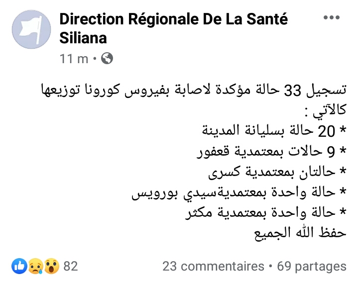 سليانة: تسجيل 33 إصابة جديدة بفيروس كورونا من قبل saber 16 أكتوبر، 2020 16 أكتوبر، 2020 اعلنت الإدارة الجهوية للصحة بسليانة مساء اليوم الجمعة 16 اكتوبر 2020 عن تسجيل 33 إصابة جديدة بفيروس كورونا بولاية سليانة. شارك 0 FacebookTwitterEmail المقال السابق سليانة: حجز قطعة أثرية و سلاح ناري دون رخصة(صور) المقال الموالي إصابات “كورونا” في الولايات المتحدة تتخطى 8 ملايين مقالات ذات صلة سليانة: افتتاح موسم جني الزيتون 25 أكتوبر، 2025 سليانة: برمجة زراعة 200 ألف هكتار زراعات كبرى 23 أكتوبر، 2025 سليانة: قريبا الإعلان عن طلب العروض المتعلق بمشروع... 21 أكتوبر، 2025 سليانة: تأثير ايجابي للأمطار الأخيرة التي شهدتها الجهة... 20 أكتوبر، 2025 الشركة الجهوية للنقل بسليانة تتسلم تتسلم حافلات جديدة(صور) 9 أكتوبر، 2025 سليانة: تنظيم يوما تحسيسيا لتقصي سرطان الثدي والاستعمال... 7 أكتوبر، 2025