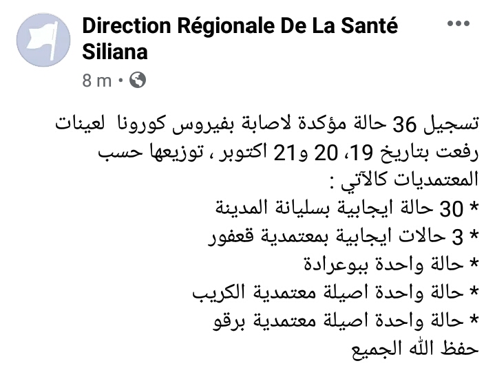 أعلنت الإدارة الجهوية للصحة بسليانة مساء اليوم الخميس عن تسجيل 36 إصابة جديدة بفيروس كورونا بولاية سليانة.