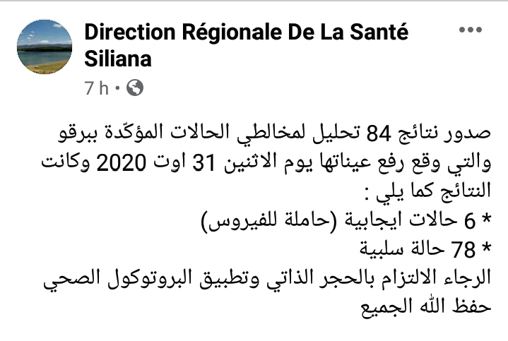 أعلنت الإدارة الجهوية للصحة بسليانة عن تسجيل 6 إصابات جديدة بفيروس كورونا اثر صدور نتائج 84 تحليل لمخالطي الحالات المؤكدة بمعتمدية برقو.