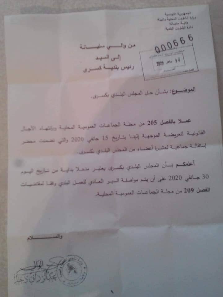 وجه ولي سليانة اليوم مراسلة رسمية إلى رئيس بلدية كسرى لإعلامه بحل المجلس البلدي بداية من تاريخ اليوم 30 جانفي 2020 ، على أن يواصل تسيير أعمال المجلس البلدي إلى حين إجراء إنتخابات جزئية.