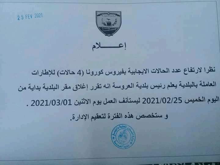 تقرر أمس الخميس غلق مقر بلدية العروسة، نظرا لارتفاع عدد الإصابات بفيروس كورونا في صفوف أعوانها إلى 4 حالات مؤكدة، وفق ما أكده صباح اليوم الجمعة رئيس البلدية شوقي الرياحي.