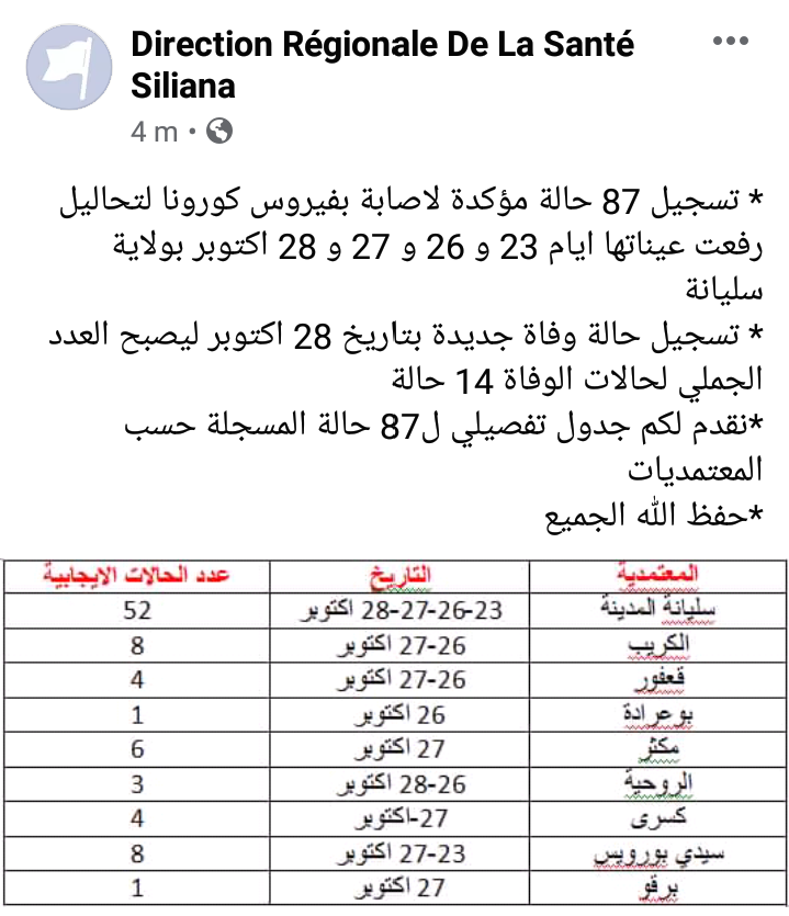 سليانة: في اعلى حصيلة..تسجيل 87 إصابة جديدة بكورونا من قبل saber 28 أكتوبر، 2020 28 أكتوبر، 2020 اعلنت الإدارة الجهوية للصحة بسليانة مساء اليوم الاربعاء عن تسجيل 87 إصابة جديدة بفيروس كورونا بولاية سليانة. شارك 0 FacebookTwitterEmail المقال السابق نحو إحداث قطب وطني للجمباز بسليانة المقال الموالي كأس رابطة الأبطال الأوروبية جوفنتوس الإيطالي ينهزم أمام برشلونة الإسباني و تشلسي الإنجليزي بلا منافس مقالات ذات صلة سليانة: افتتاح موسم جني الزيتون 25 أكتوبر، 2025 سليانة: برمجة زراعة 200 ألف هكتار زراعات كبرى 23 أكتوبر، 2025 سليانة: قريبا الإعلان عن طلب العروض المتعلق بمشروع... 21 أكتوبر، 2025 سليانة: تأثير ايجابي للأمطار الأخيرة التي شهدتها الجهة... 20 أكتوبر، 2025 الشركة الجهوية للنقل بسليانة تتسلم تتسلم حافلات جديدة(صور) 9 أكتوبر، 2025 سليانة: تنظيم يوما تحسيسيا لتقصي سرطان الثدي والاستعمال... 7 أكتوبر، 2025