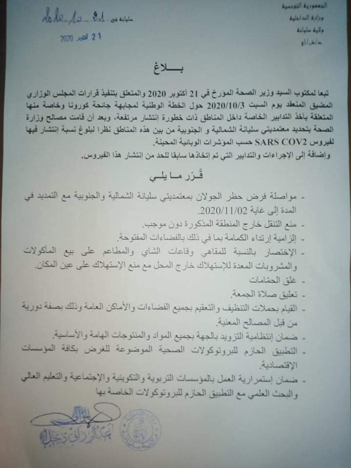 -مواصلة فرض حظر التجول بمعتمديتي سليانة الشمالية والجنوبية مع التمديد في المدة إلى غاية 2 نوفمبر القادم