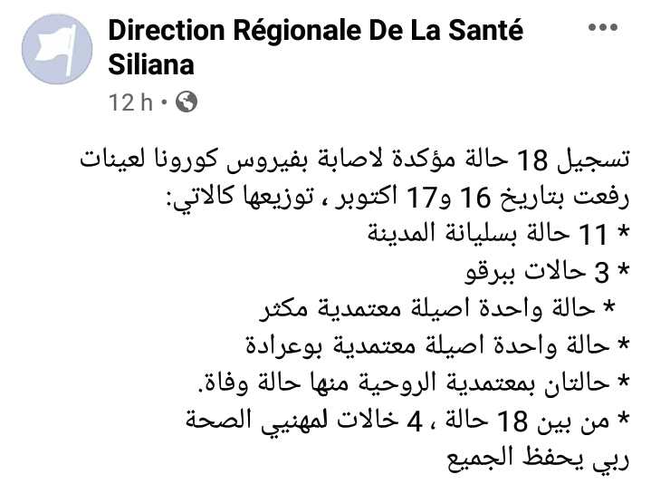 سليانة: 11 إصابة جديدة بفيروس كورونا من قبل saber 18 أكتوبر، 2020 18 أكتوبر، 2020 أعلنت الإدارة الجهوية للصحة بسليانة مساء اليوم الأحد عن تسجيل 11 إصابة جديدة بفيروس كورونا بولاية سليانة. شارك 0 FacebookTwitterEmail المقال السابق المشيشي: قرارات بالغلق ضد المخابر التي لا تلتزم بتسعيرة تحليل كورونا المقال الموالي المشيشي : “لازمنا شوية وقت لتفعيل القانون الإستثنائي للإنتداب في الوظيفة العمومية” مقالات ذات صلة سليانة: برمجة زراعة 200 ألف هكتار زراعات كبرى 23 أكتوبر، 2025 سليانة: قريبا الإعلان عن طلب العروض المتعلق بمشروع... 21 أكتوبر، 2025 سليانة: تأثير ايجابي للأمطار الأخيرة التي شهدتها الجهة... 20 أكتوبر، 2025 الشركة الجهوية للنقل بسليانة تتسلم تتسلم حافلات جديدة(صور) 9 أكتوبر، 2025 سليانة: تنظيم يوما تحسيسيا لتقصي سرطان الثدي والاستعمال... 7 أكتوبر، 2025 سليانة: الإعداد لقبول 1000 طفل في إطار برنامج... 6 أكتوبر، 2025