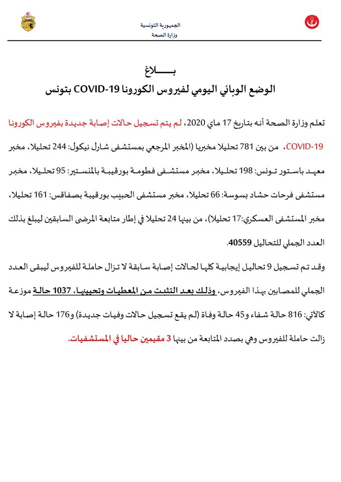 تعلم وزارة الصحة أنه بتاريخ 17 ماي 2020، لم يتم تسجيل حالات إصابة جديدة بفيروس الكورونا COVID-19، من بين 781 تحليلا مخبريا (المخبر المرجعي بمستشفى شارل نيكول: 244 تحليلا، مخبر معهد باستور تونس: 198 تحليلا، مخبر مستشفى فطومة بورقيبة بالمنستير: 95 تحليلا، مخبر مستشفى فرحات حشاد بسوسة: 66 تحليلا، مخبر مستشفى الحبيب بورقيبة بصفاقس: 161 تحليلا، مخبر المستشفى العسكري: 17 تحليلا)، من بينها 24 تحليلا في إطار متابعة المرضى السابقين ليبلغ بذلك العدد الجملي للتحاليل 40559.