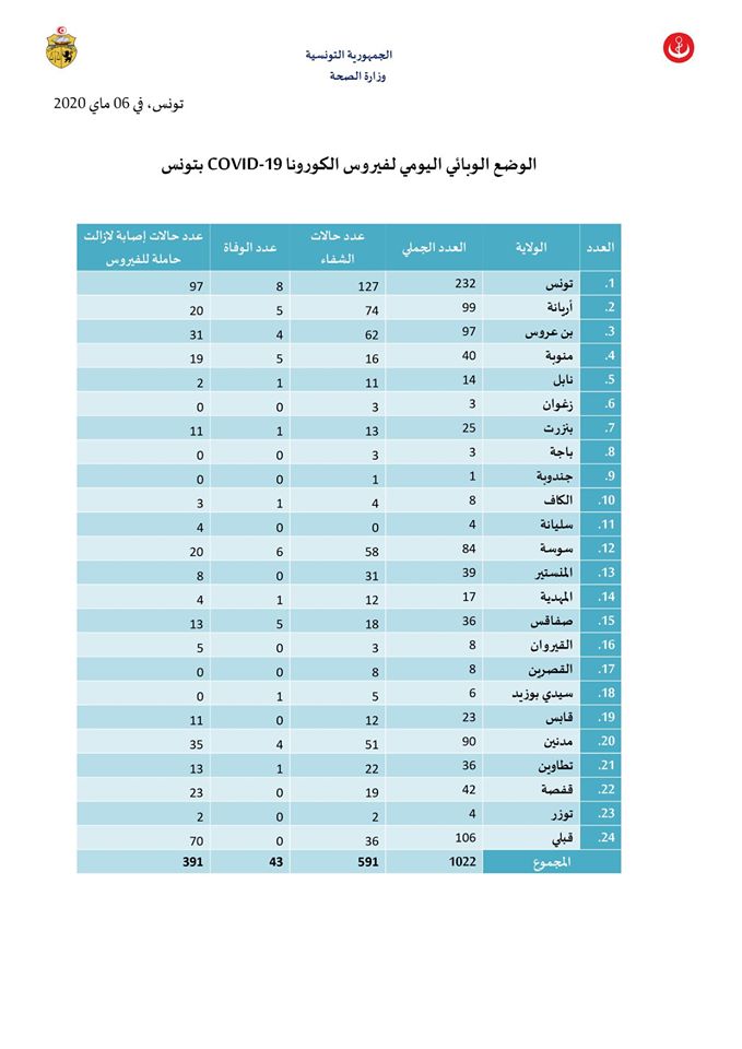 وقد تم تسجيل 32 تحليلا إيجابيا، 29 منها حالات إصابة سابقة لا تزال حاملة للفيروس و3 حالات إصابة جديدة ليصبح العدد الجملي للمصابين بهذا الفيروس، وذلك بعد التثبت من المعطيات وتحيينها، 1025 حالة مؤكدة من بينها: 591 حالة شفاء و43 حالة وفاة و391 حالة إصابة لا زالت حاملة للفيروس وهي بصدد المتابعة.