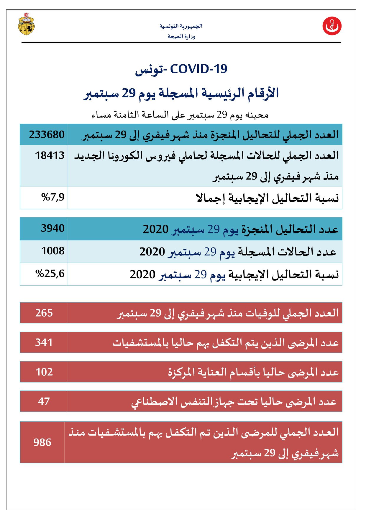 أعلنت وزارة الصحة اليوم الأربعاء تسجيل 1008 إصابة جديدة بكورونا ليوم 29 سبتمبر 2020 من جملة 3940 تحليلا منجزا.