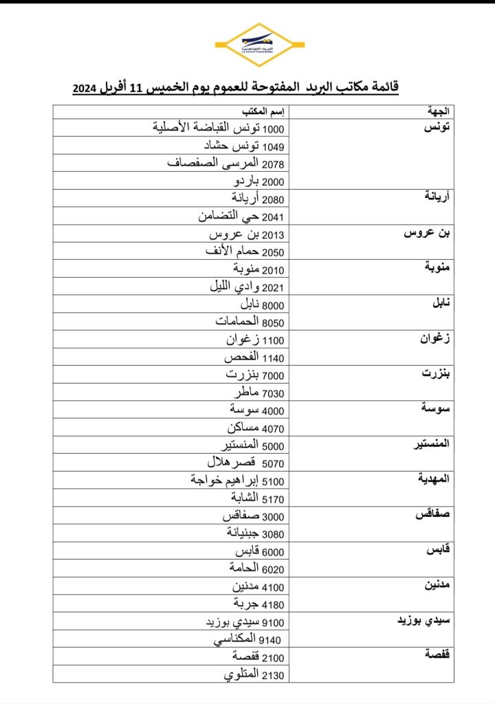 أعلن البريد التونسي، الجمعة 5  2024، أنه تقرر وبصفة استثنائية فتح 50 مكتب بريد موزعة على مختلف جهات الجمهورية لتأمين حصة عمل يوم الخميس 11 أفريل 2024.